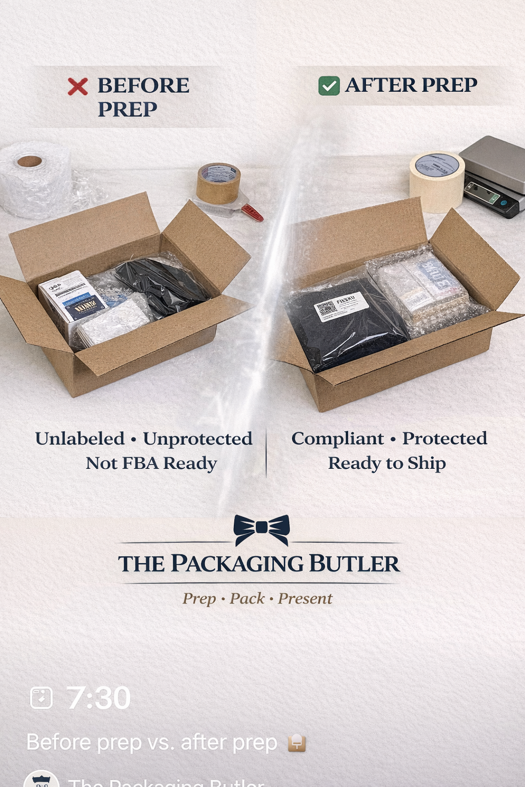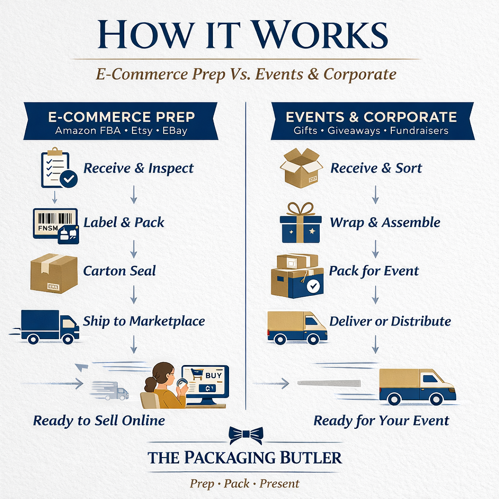 "Professional FBA prep & packaging for Amazon, Etsy, eBay sellers + corporate events. Expert labeling, poly bagging, bundling & fulfillment on the East Coast."